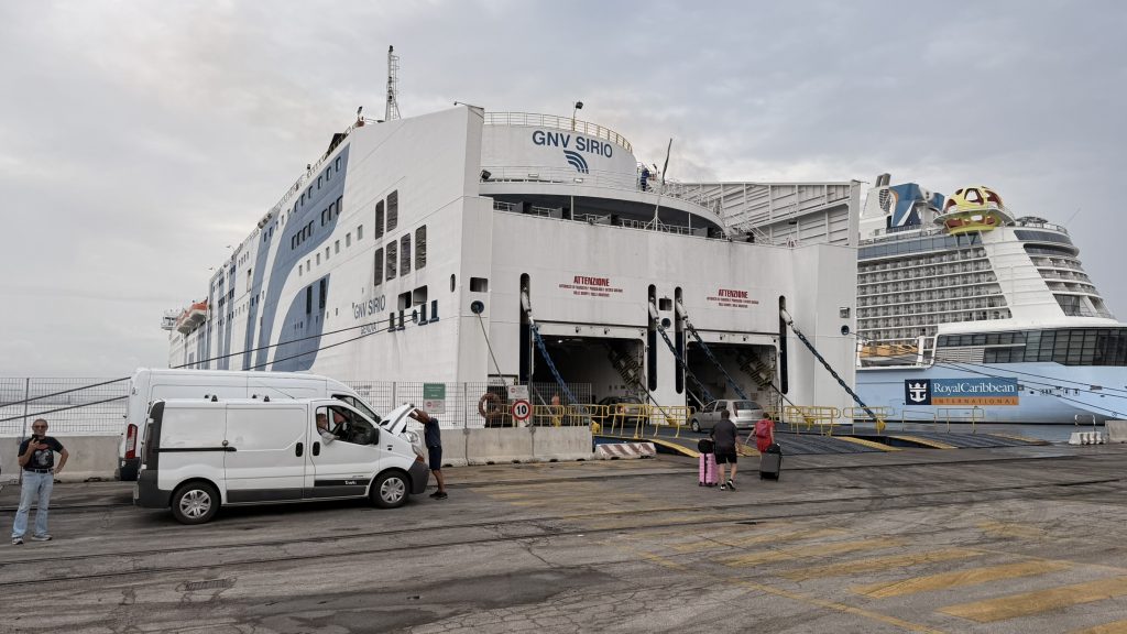 Kurz vor der Abfahrt erwischt uns ein Gewitter der besonderen Art. Die Straße sind innerhalb von Sekunden überflutet und auf dem Weg zum Hafen läuft auf der Autobahn ein kleiner Fluss. Trotzdem kommen wir gut durch und erwischen einen Seiteneingang zum Fährhafen (manchmal ist es clever den LKW einfach hinterher zu fahren). CheckIn und Boarding gehen in Neapel wirklich gut von statten. Da hatten wir bei den Fähren auch schon deutlich chaotischere Zustände.